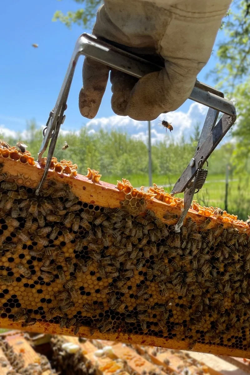 Hornaday utilizes a clamp tool to slowly lift and transfer a frame from one side of a hive, to the other. By doing this, Hornaday was able to create more space in certain parts of the hive, making room for the next hatch of bees.